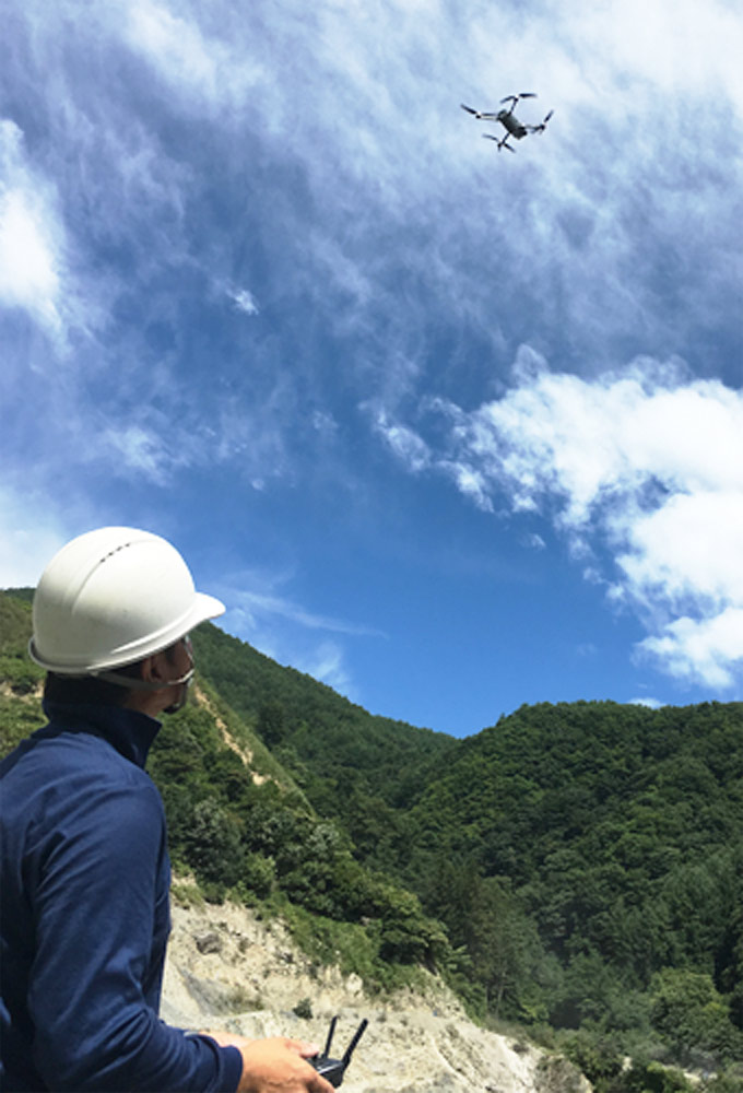 UAV現場空撮 ドローン(UAV)に搭載したデジタルカメラで現場撮影し、写真(画像データ)から地形の3次元位置座標を出力することができます。レーザースキャナでは撮影できない部分もUAVを導入することにより、より立体を細部まで測量、図化することが可能です。